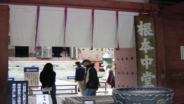 左右には長さ90mの回廊があり、くぐり戸から中に入ると、正面の根本中堂の巨大さに圧倒される。