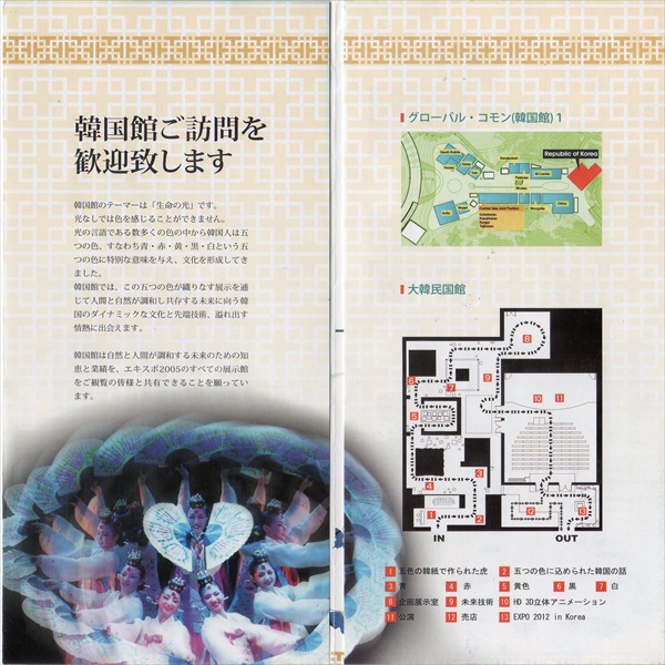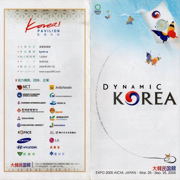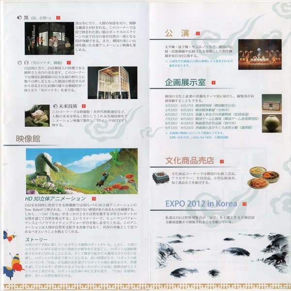 「生命の光」をテーマに青、赤、黄、黒、白の5色に溶け込んだ韓国人の自然観、生命観、独特の文化と産業を紹介している。