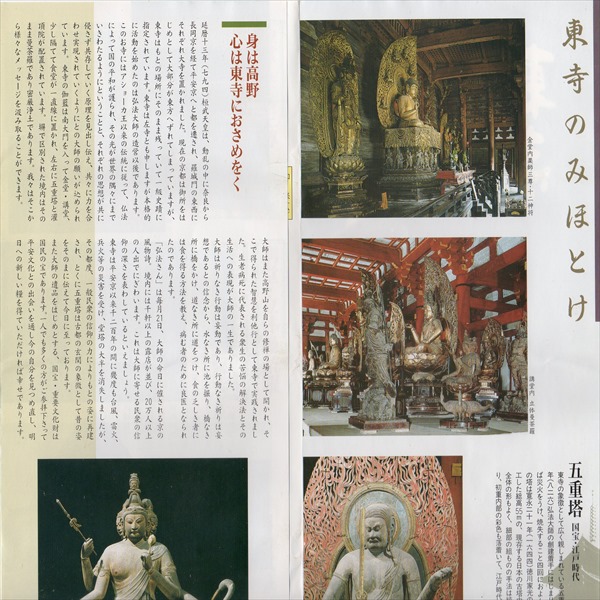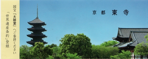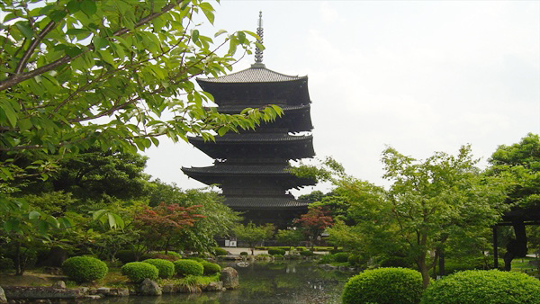 東寺真言宗の総本山。794年(延暦13)の平安京造営に際し、その2年後、国家鎮護のため羅城門の東に創建。823年(弘仁14)空海(弘法大師)に下賜された。講堂(重文)には大日如来を中心に国宝の五大明王など21体の仏像を安置。この配列は立体曼荼羅といわれる。金堂(国宝)は豊臣秀頼の再建。大師堂(御影堂・国宝)は、大師在世時の住房で、弘法大師像(国宝)と、大師念持仏の不動明王坐像(国宝)を安置。五重塔(国宝)は徳川家光が再建、高さ55mで、わが国最高。ちなみに善通寺の五重塔は高さ46mです。