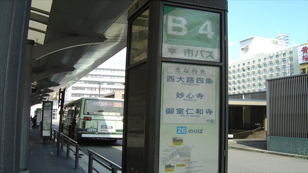 妙心寺へはB4乗り場、市バス26系統に乗車します(約40〜45分)、停留所「妙心寺北門前」で下車します。