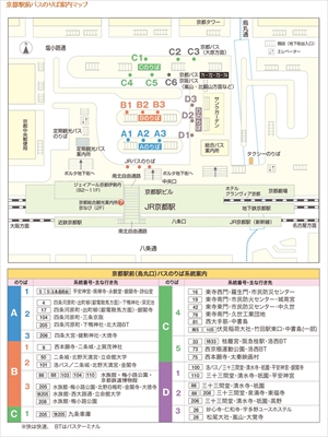 金閣寺へは「バスチケットセンター」内にある、市バス京都駅前案内所で一日乗車券カード(500円)を買う。B2から出る101系統のバス「二条城・北野天満宮・金閣寺行」に乗り、13番目の停留所「金閣寺道」で下車するか、B3乗り場の205系統「金閣寺・北大路バスターミナル行」に乗り、21番目の停留所「金閣寺道」で下車します。所要時間は35〜40分です。