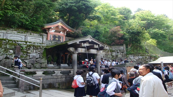 万病に効く音羽の滝 京都東山36峰に連なる音羽山から下りてきた地下水が3本の筧(かけい)を伝って滝壺に落ちています。