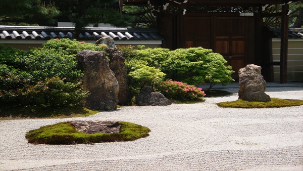 建仁寺の庭 方丈南側の枯山水の白砂に緑苔と巨岩を配した前庭「大雄苑」の風景
