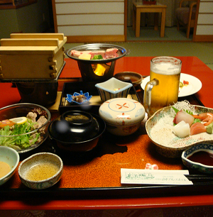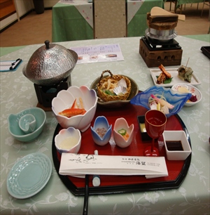 もみじ亭の部屋食でいただき、料理左上のフタ付蒸器の中は蟹が入っています
