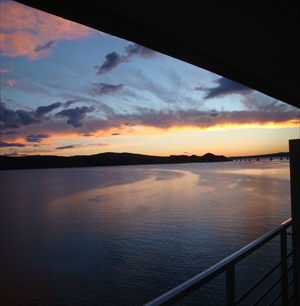 ホテルの部屋から能登島との間の七尾西湾を眺めると、遠くには「ツインブリッジのと」(反対側には能登島大橋、昔は通行料がかかりましたが、現在は無料とのことです)が見えています。