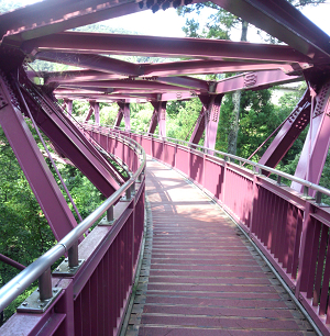 鶴仙渓遊歩道のほぼ中心に架かるひときわ目をひく紅紫色のS字橋「あやとりはし」。あやとりを模したデザインは華道草月流家元勅使河原宏氏によるもの。こおろぎ橋から遊歩道に入り、20~30分歩くと赤い橋が見えてくる。遊歩道から見上げた橋はどこにでもある普通の橋に見えるがユニークな形のS字をした橋で、橋の前の立つと不思議な感覚になる。こおろぎ橋が伝統ある橋なのに対したあやとり橋はモダンな橋でありその対比が面白い。