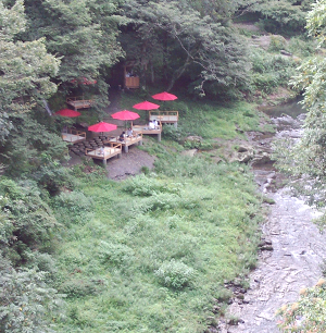 大聖寺川沿いにある緑豊かな渓谷がよく見えます、川の水の流れや水音に癒されます。 川床でのお茶やお菓子も風情があってとても良いです。