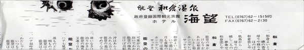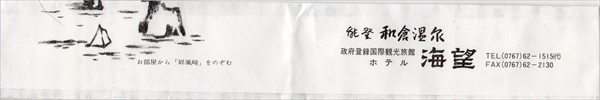 創業は明治23年(1890年)。 和倉温泉でもとくに風光明媚な景色からついた 海を望むという宿の名のとおり、 目の前にひろがる海の眺め、香り、さざめきは、 いつの時代も訪れる人をやさしく迎え、風呂に入ると七尾湾の絶景につかっているような感覚、 能登の旅を深く心に刻んできました。泊まったのは海側516号室です